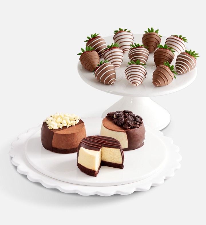EXCLUSIVE A decadent dream for cheesecake lovers. Our trio offers a unique blend of rich flavor profiles: creamy New York-style cheesecake, Oreo® featuring the cookie favorite and sinful chocolate truffle. Paired with our juicy, gourmet dipped strawberries, it’s a sweet way to celebrate special people and.